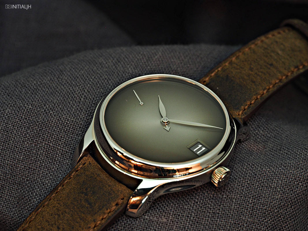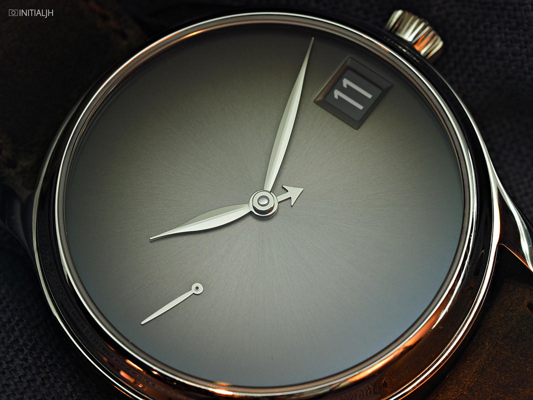So if you look at the older sibling above and compare it with this one, you will see what has gone in the name of minimalism. Basically, all that is left on the dial are hands, a date window, and Moser’s distinctive and renowned fumé dial. No markers, no branding, no writing.