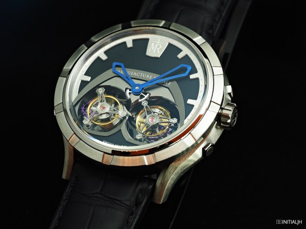 Coming in both titanium and rose gold versions, as you can see in this titanium cased one, both case and dial have a variety of finishes, with both polished and brushed matte surfaces that make the bold design codes of this watch even more marked. The ‘cut out’ for the tourbillons is contemporary and prominent, so this is not a watch for those seeking softer lines or traditional design notes, but it makes for a very sporty double tourbillon.