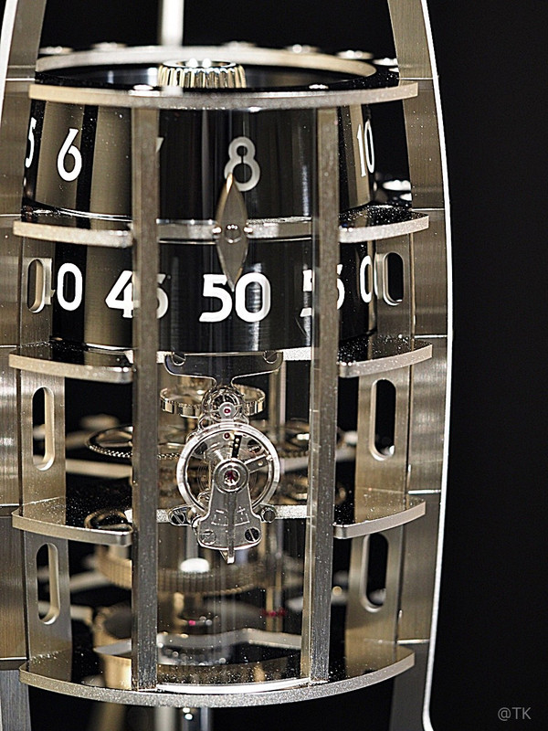 Powered by a single barrel, the clock’s movement is composed of 164 parts, with mirror polishing, bead blasting and satin brushed finishing. It is made of palladium-plated brass, stainless steel and nickel-plated stainless steel. The rocket’s body is stainless steel, and the hour and minute indications stamped on rotating stainless steel discs