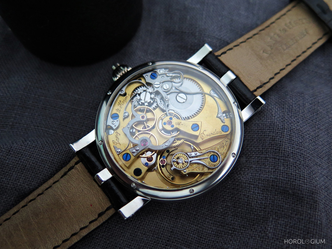 This Albert’s 44mm case is white gold, with a height of 12.5mm. The pusher, integrated into the crown, requires a firm depression to activate the chronograph function, but what is interesting is the crown. Inside this watch is the manual-wind Calibre IV with a 46 hour power reserve. The winding of the crown is just buttery smooth. For those who like manually wound watches, you will not be disappointed with this.