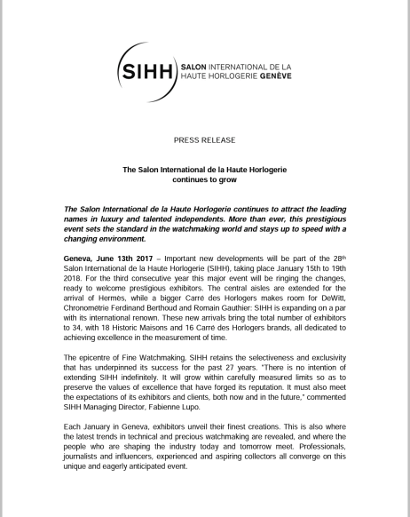 In news just announced, the SIHH will expand even further, welcoming Ferdinand Berthoud, De Witt, whose boutique we visited in Geneva just before SIHH 2016, Romain Gauthier, and Hermès. We look forward to visiting you next year. SIHH 2018 will be held between 15-19 January, 2018 and will again open its doors to the public for one day. To keep updated, check their website here