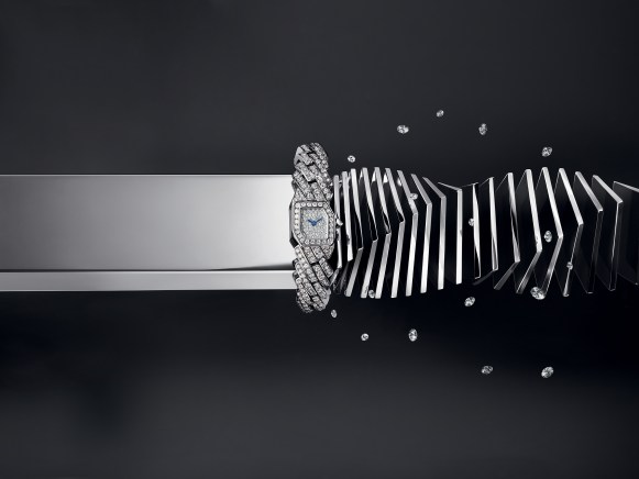 As well as these five models will form part of Cartier’s general collection, there is a model that is numbered and limited to fifty pieces. It is 18k yellow gold with the case and bracelet set with 580 brilliant-cut diamonds totalling 9.33 carats. The crown is also set with a brilliant-cut diamond (0.07ct). The dial for this model is black lacquer.