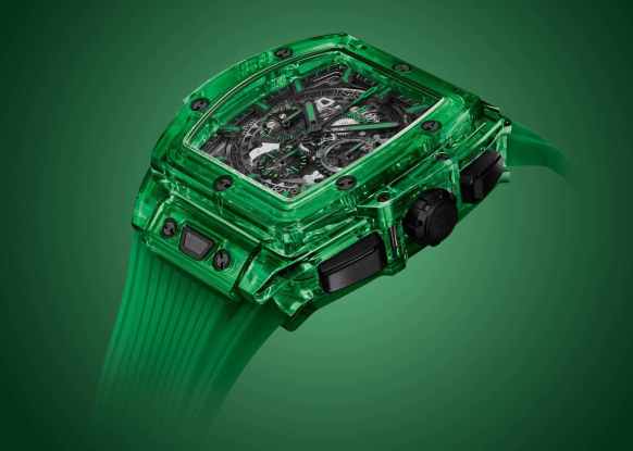 Hublot’s Spirit of Big Bang Green SAXEM comes in a limited edition of one hundred pieces. Strap-wise it’s a transparent rubber with a black ceramic and black-plated titanium deployant. This is pretty much as green-coloured as any watch is going to be this year, and in a form that is aimed squarely at fans of Hublot’s use of sapphire and colour.
