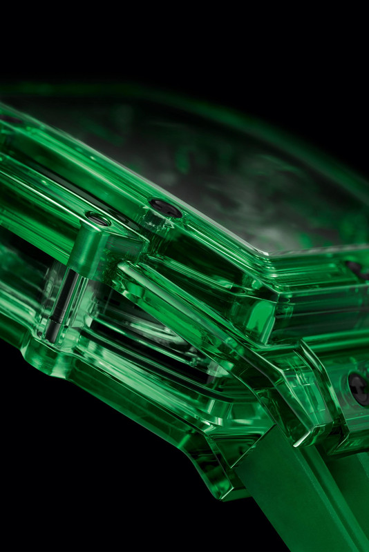 The 42mm polished green case with a water resistance of 50m is home to the skeletonised automatic Calibre HUB 4700, whose base is the Zenith El Primero 400. It beats at 36,000 VPH, has a power reserve of fifty hours, and powers a column wheel chronograph and date function.