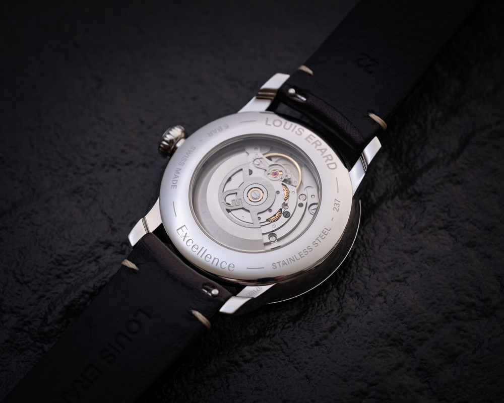 Inside is the automatic Swiss SW266-1 movement, which beats at 28,800 VPH and has a power reserve of 38 hours. It has an open-worked rotor with the Louis Erard logo.