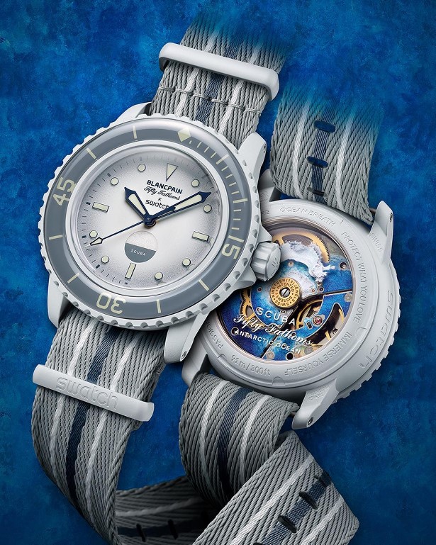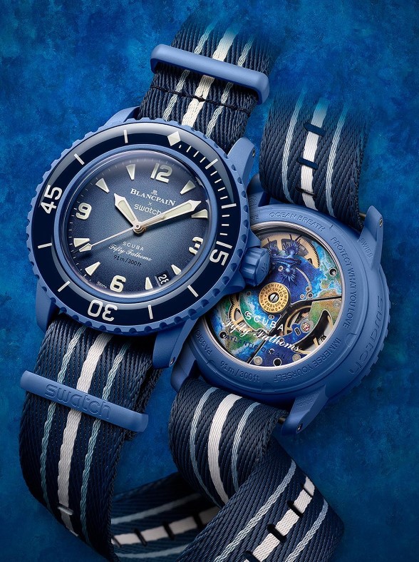 The Blancpain X Swatch Bioceramic Scuba Fifty Fathoms Collection pieces come on striped colour-matched NATO-style straps made from recycled fishing nets.