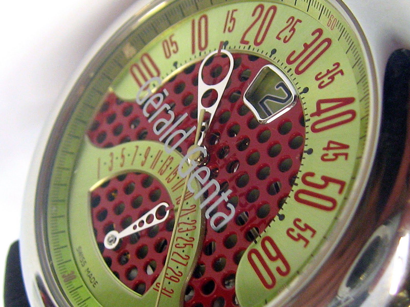 This uncommonly seen exemplar of the Arena biretro line, with its distinctive red/ green colour combination, has that renowned playful Genta approach.