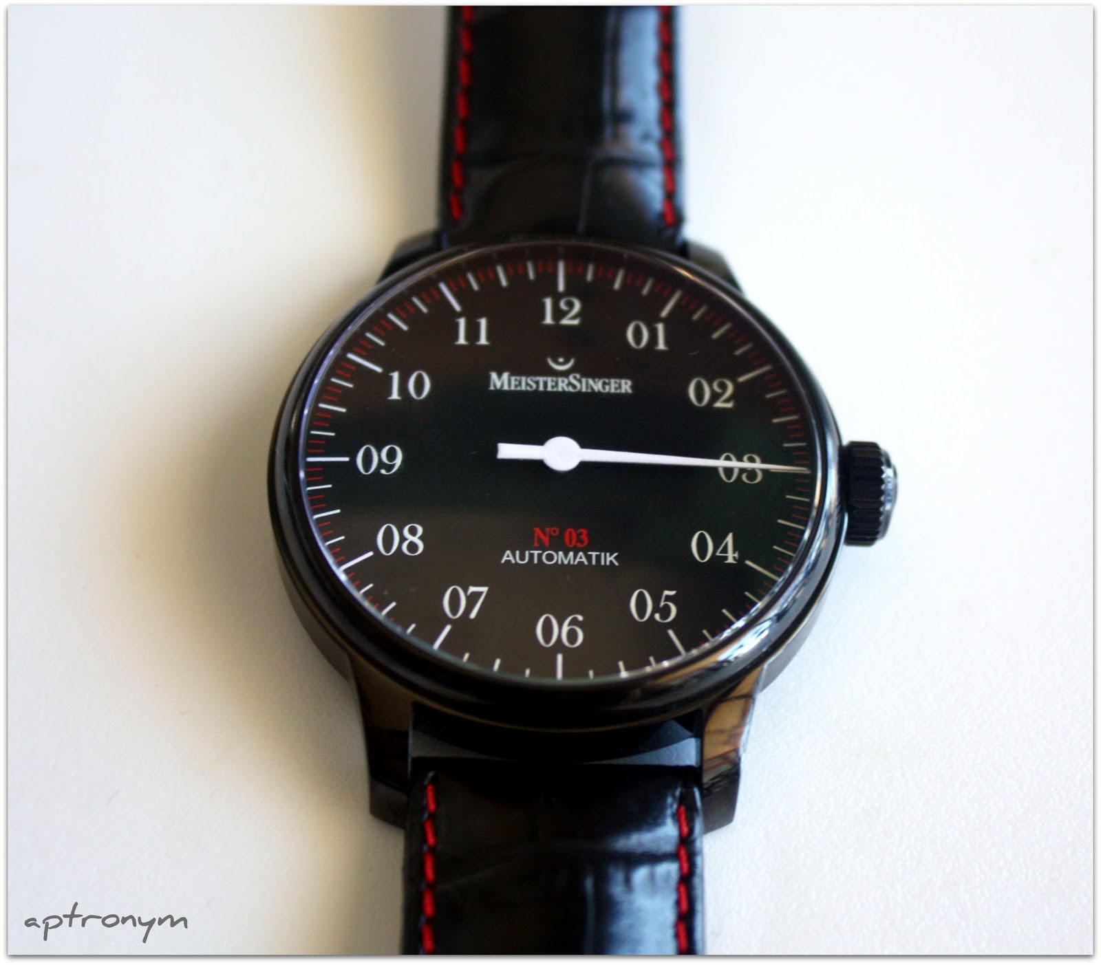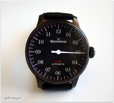 2010 has seen a special sporty addition to MeisterSinger’s No.3 line. The No.3 AM911 has only just hit the retailers in Australia, and is not even on their website yet. An all black PVD affair, the five minute markers are in red, the colour theme continuing onto the ‘No.3’ and the stitching in the leather strap.