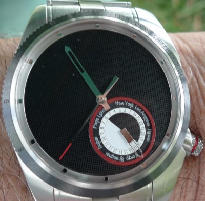 This satellite, within a red border, orbits within itself, rotating once every 24 hours to act as a multiple time-zone indicator, with the time at eight cities from different parts of the globe shown on its dial. It is of course no problem to extrapolate the time for cities not listed. The satellite dial is one half white and the other black to indicate day and night.