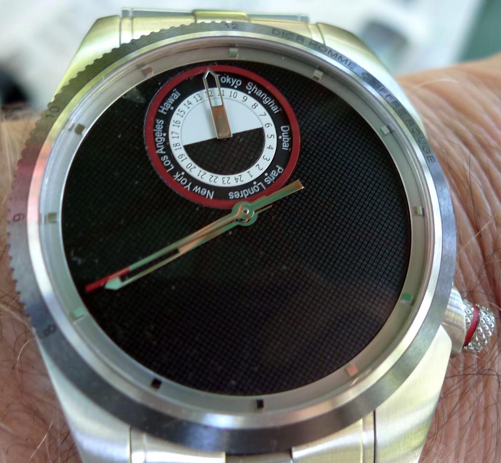 This satellite, within a red border, orbits within itself, rotating once every 24 hours to act as a multiple time-zone indicator, with the time at eight cities from different parts of the globe shown on its dial. It is of course no problem to extrapolate the time for cities not listed. The satellite dial is one half white and the other black to indicate day and night.