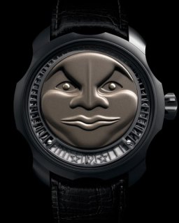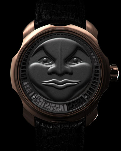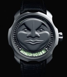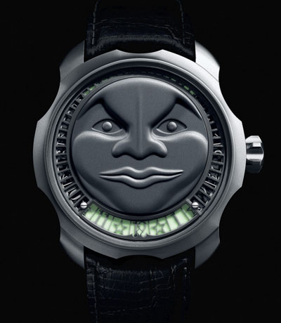 It comes in a white gold version and a black diamond coated steel one, and the caseback is Sarpaneva’s well known winding mass.