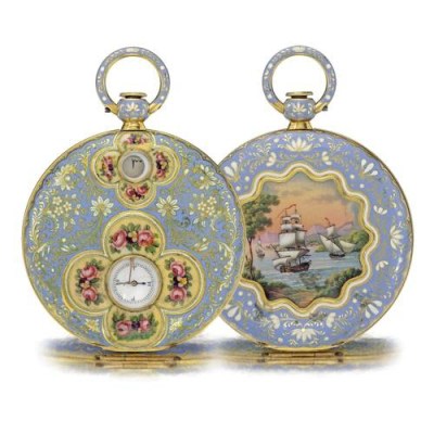 Cylinder movement, gold cuvette enhanced by flowering vines in gold and opaque powder blue enamel, against a guilloche ground with translucent peach enamel. White enamel dial with Turkish numerals, aperture for jumping hours, eccentric chapter ring, subsidiary seconds. Case with apertures displaying hours and seconds, each framed in lobed cartouches depicting bursts of spring flowers, the background with opaque blue enamel and flowering vines, the reverse with polychrome enamel painting of ships within a seascape in scalloped frame. Case and cuvette numbered. Diameter 48 mm.