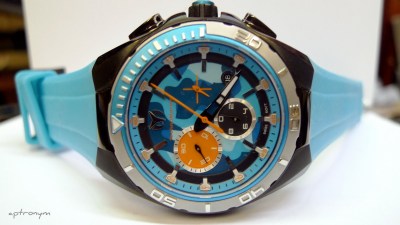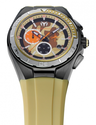 The Cruise Steel Camouflage series is Technomarine’s crack at the eternally popular “fashion camo” look, featuring a vivid camouflage design on the dial matched by a coordinating strap and contrasted by either a black PVD coated or pink gold case.