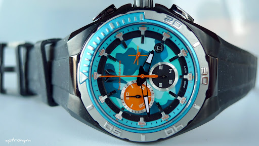 The owner of this watch has a penchant for blue on his watches, and this is part of what appealed to him about the Camouflage, but even he tends to wear the black rather than the blue strap. It looks is considerably more low key and black is, of course, the most flexible of all colours.