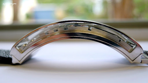 The shape of the case means that the plate is a circular arc, the wheels of the movement in a line. The crown is at six o’clock.