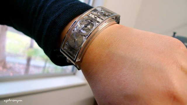 When I first saw photos of this watch, the first (and dominant) question was as to whether the length and strong curve meant that it would not fit comfortably on all wrists. In discussing it with many others, this seemed, above all else, to be the biggest concern. Despite having seen some photos of it on Eva’s (and other people’s wrists) from Baselworld, the query remained.