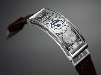This is a deceptively simple looking but bold and innovative watch. There have been curved watches before, such as the Movado Polyplan (whose crown is at ’12’), Gruen Curvex, and from Bulova in the 1940s, but those were more gentle curves, in comparision, not the distinctive attention-grabbing dramatic lines of the Ari.