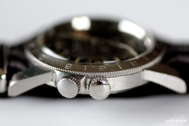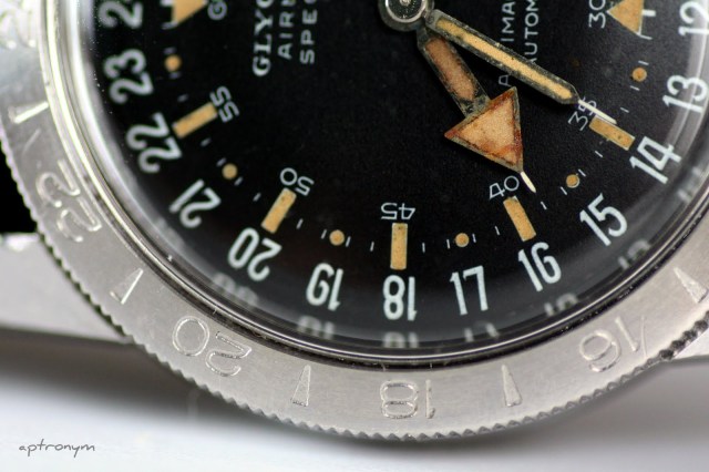 This model is a Glycine Airman Special (there were both “Glycine Airman” and “Glycine Airman Special” models) with an automatic Felsa 692 movement, which puts it in the 1953 – 1960 range of production. I was told by the dealer that my model is from circa 1958. It has the black date indicator rather than the red one, and a working hacking seconds. I admit that my first choice had been for a red date indicator (and a cross hatched crown), but in the end, this watch was priced too attractively to pass.