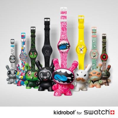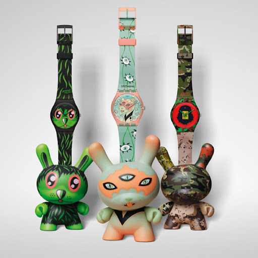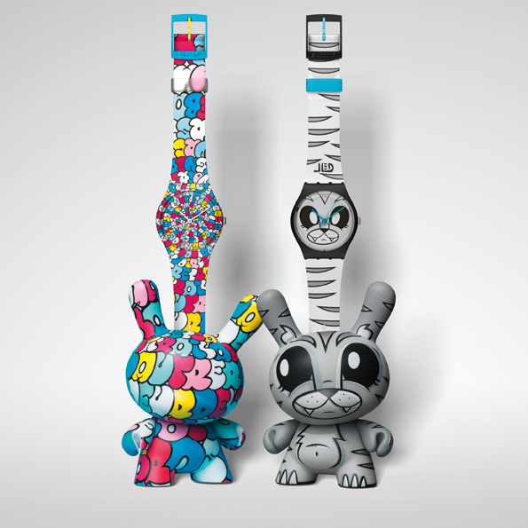 This time, Kidrobot have partnered with Swatch for a collection of eight Swatch Gents, each accompanied by a complimentary (and complementary) Dunny. Dunny is Kidrobot’s iconic and collectible ‘bunny’ vinyl toy which, in addition to being collectible in its own right, has also come out in customised versions. For the Swatch collaboration, artists Gary Baseman, Jeremyville, Frank Kozik, Joe Ledbetter, MAD, Tara McPherson, SSUR, and Tilt were chosen to design both the Gent and the accompanying Dunny.