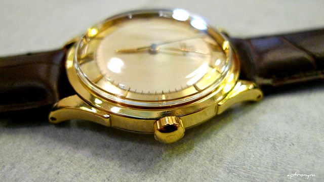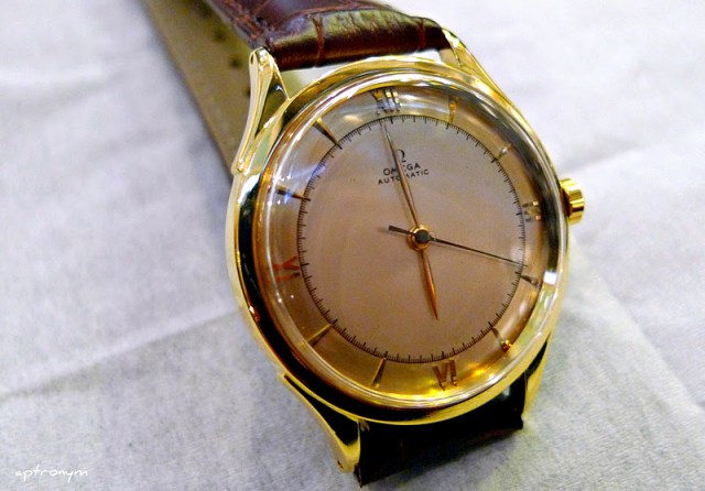 This is a 1946 (10M service number) 18kt solid gold Omega with bumper automatic movement Calibre 28.10. There is a watch identical to this one in the Omegamania catalogue, called the “Ambassador” model.