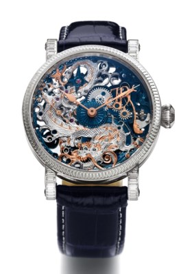 The ‘Black Dragon’ features a ‘hovering’ dragon over a skeletonised sterling silver dial, beneath which can be seen a blackened, hand-skeletonised movement. It is available in rose gold with 77 diamonds or in rose gold with a guilloché bezel.