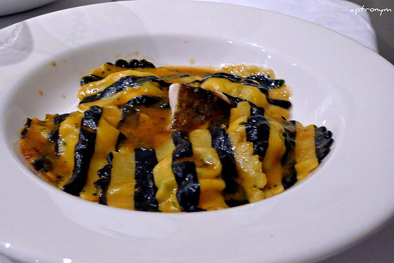 Squid ink ravioli filled with John Dory & zucchini in potato and crayfish bisque $27