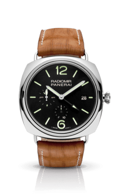Hand-wound mechanical, Panerai P.999 calibre, executed entirely by Panerai, 12 lignes, 3.4 mm thick, 19 jewels, Glucydur® balance, 21,600 alternations/hour. Incabloc® anti-shock device. Swan’s neck regulator. Power reserve 60 hours. 154 components.