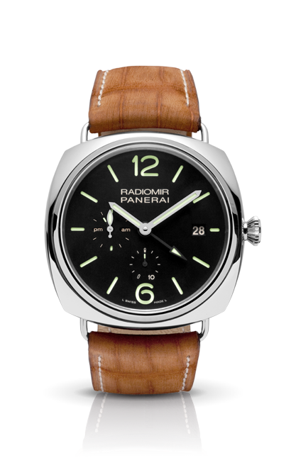 Hand-wound mechanical, Panerai P.999 calibre, executed entirely by Panerai, 12 lignes, 3.4 mm thick, 19 jewels, Glucydur® balance, 21,600 alternations/hour. Incabloc® anti-shock device. Swan’s neck regulator. Power reserve 60 hours. 154 components.
