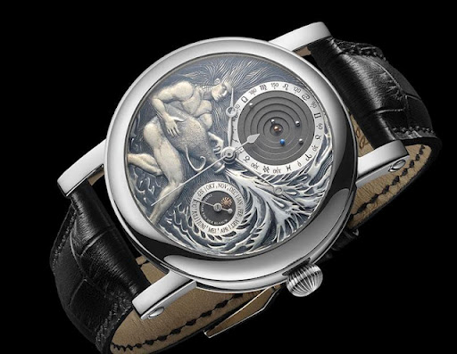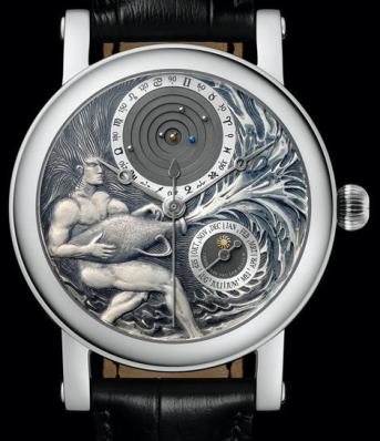 Based on the Planetarium, but really not resembling it at all, the Aquarius’ dial is dominated by an amazingly intricate depiction of this astrological sign in white gold. At 12 o’clock is the well-known planetarium, showing the cycles around the sun of the revolving Mercury, Venus, Earth, Mars, Jupiter and Saturn.