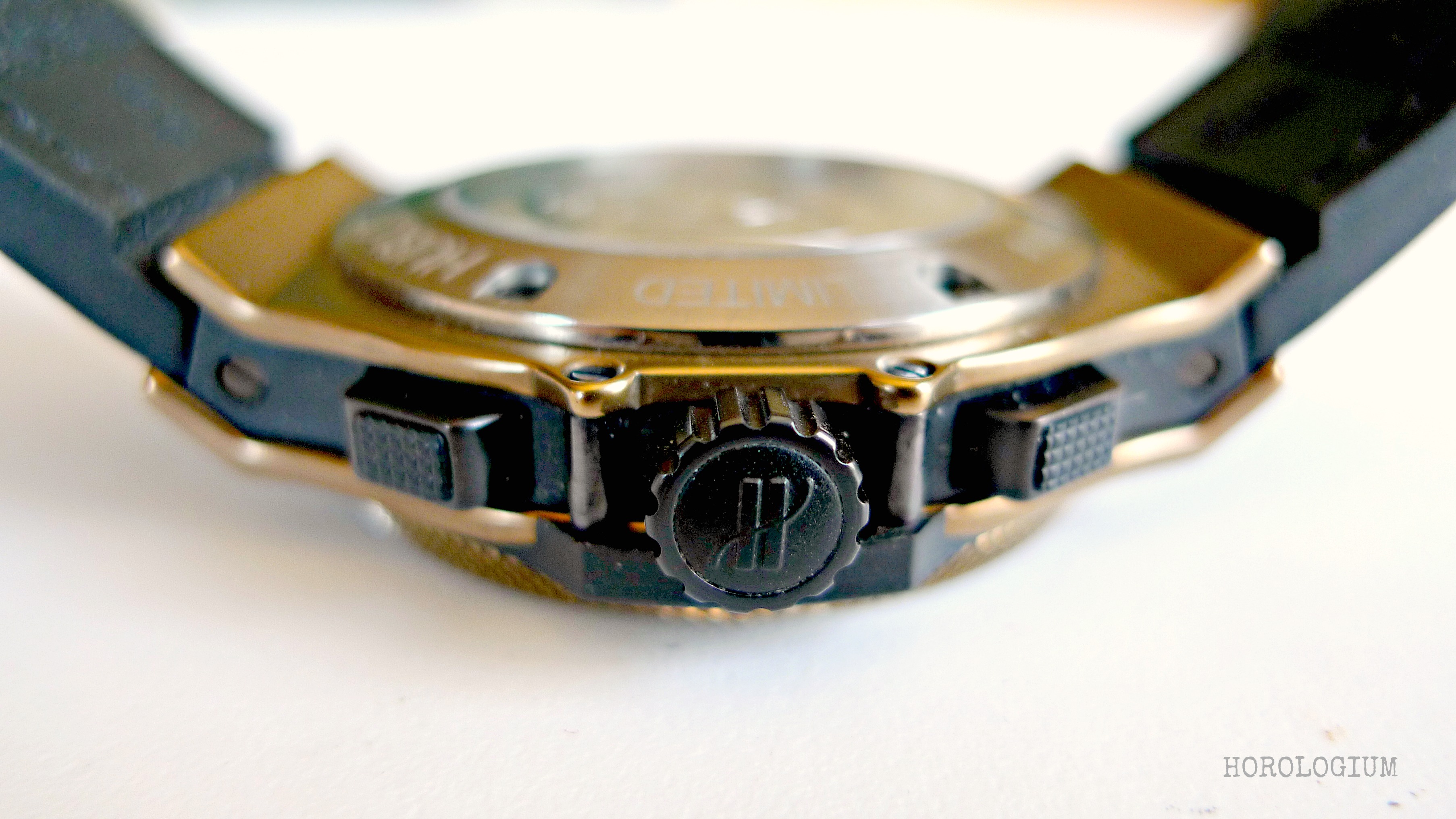 The pushers are made of stainless steel with black PVD and require a firm hand to activate. Next to the pushers, the side inserts are made of black composite resin. The crown is also stainless steel PVD.