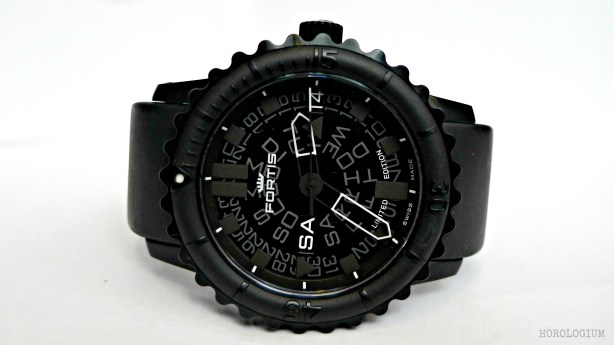 An anti-reflective sapphire crystal shows a transparent matte black tinted dial that is dominated by a view of an ETA 2836-2 automatic day/ date movement (which Fortis call their F-2016), with incabloc shock absorber.