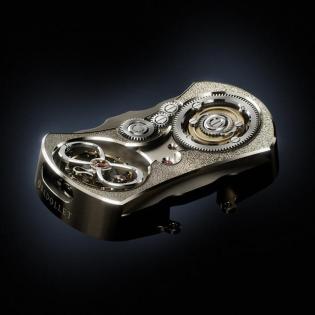 Requiring 420 hours to assemble, the Ivresse’s case was created by the well-known designer Eric Giroud in 950 platinum (i.e. 95% platinum). Measuring 53.80mm in length and 30mm in width, it is characterised by a rectangular rounded bezel which juts out from the lower level of the case. Inside lies a flying tourbillon which is, rather unusually, visible only through the anti-reflective sapphire crystal case back, instead of being displayed front and centre of the watch.