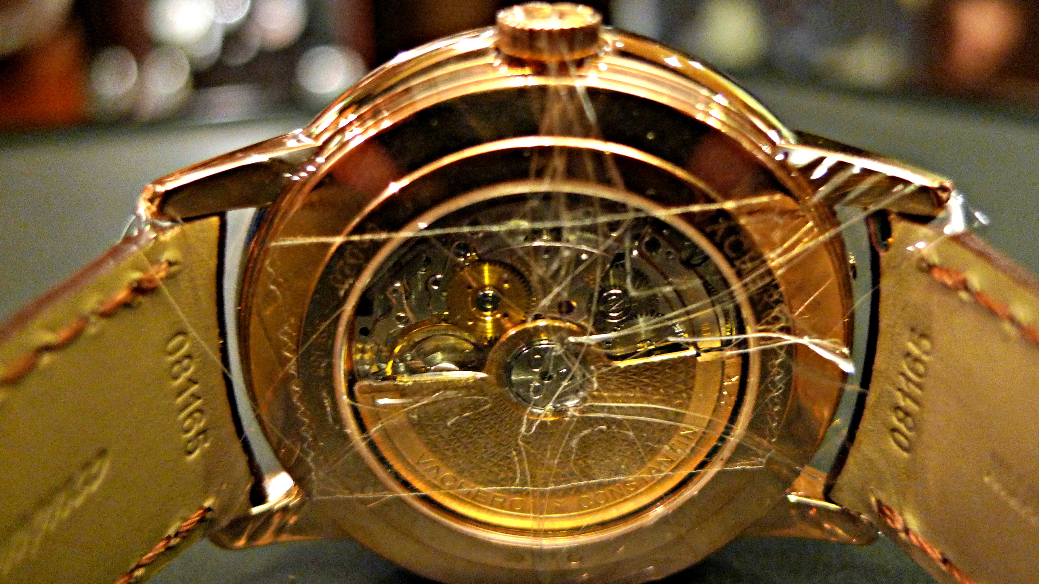 If you turn it over, there’s a sapphire open caseback which reveals Vacheron’s Ref.2460 movement, which they regards as a descendant of their well-known and well regarded automatic Cal.1120 that they introduced in the 1960s. Calibre 1120 itself is a version of Jaeger-LeCoultre’s Calibre 920. The movement is 5.40mm thick with 283 parts, 27 jewels, a frequency of 28,800 VPH and an approximately 40 hour power reserve.