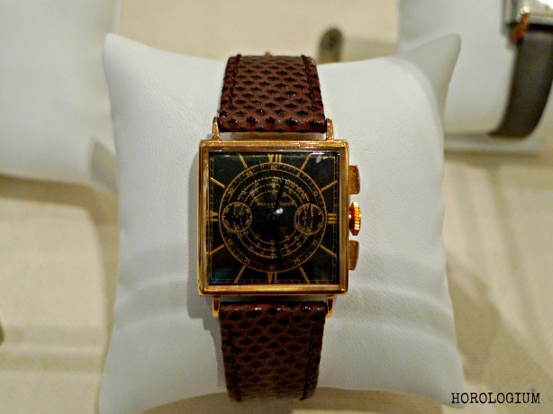 Another sqaure watch from 1940 and also hand-wound, this is a column wheel chronograph with a pink gold case and black dial.