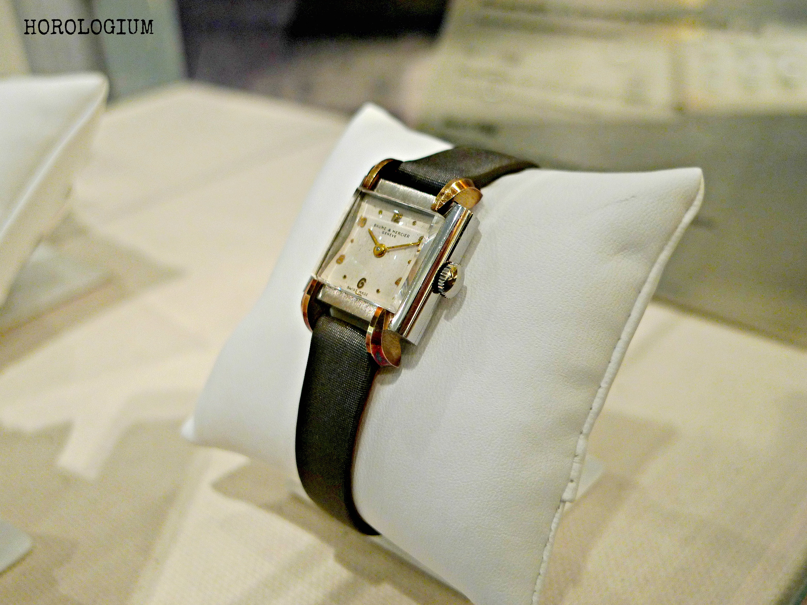 A steel and pink gold square watch from 1940 is next. It contains a hand-wound mechanical movement.
