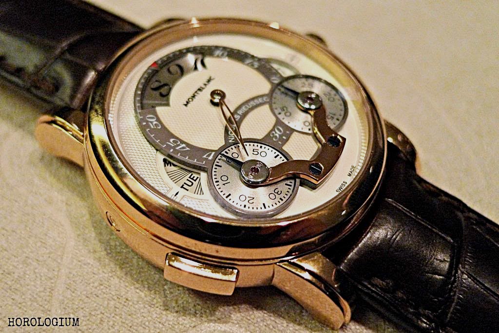 Montblanc have paid tribute to him with previous Rieussec models with two discs, and this year’s model, which I had the opportunity to see at SIHH 2013, is the Rising Hours. This new model has the hours and minutes on an off-centre dial, digital hour with day/ night indicator, a date and day display via disc and a travel function with fast setting of the hour and date display. The chronograph has two counters for 60 secs and 30 minutes, which means that the only hand is for the minutes.