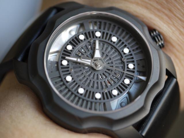 From that point the watch’s development was down to decisions about the colours and materials for the moon, sky, dial, hands, case. Inside would be the modified Soprod A10 (for the moon) which is Sarpaneva’s movement of choice. The A10 has 28,800 VPH and a 42 hour power reserve. Outside would be a 46mm DLC case of 10.5mm height with brushed steel grey hands, grey sky, grey dial, and silver and black moons, to complete the ‘stealthiness’.