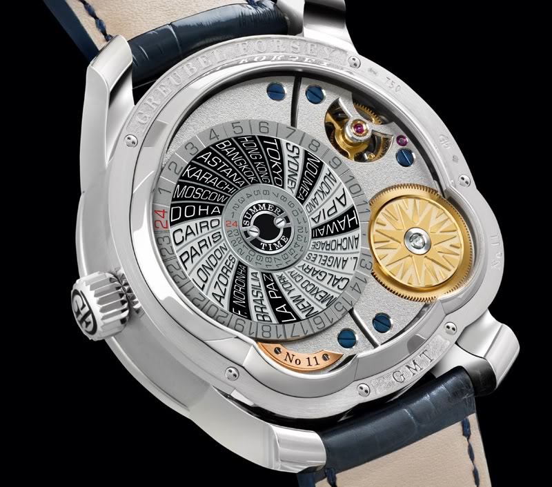 The GMT in this post is white gold (it also comes in 5N red gold). It has an asymmetrical convex synthetic sapphire crystal, along with a transparent case back of the same through which you can see the hand-wound Greubel Forsey Calibre GF05 with 72 hour power reserve and patented tourbillon. The movement is 9.80mm thick and has 443 parts. The mainplates are nickel silver, as are the bridges. The tourbillon has 87 parts, inclined at a 25 degree angle and 24-second rotation. The tourbillon cage has titanium cage bridges and a gold counterweight.