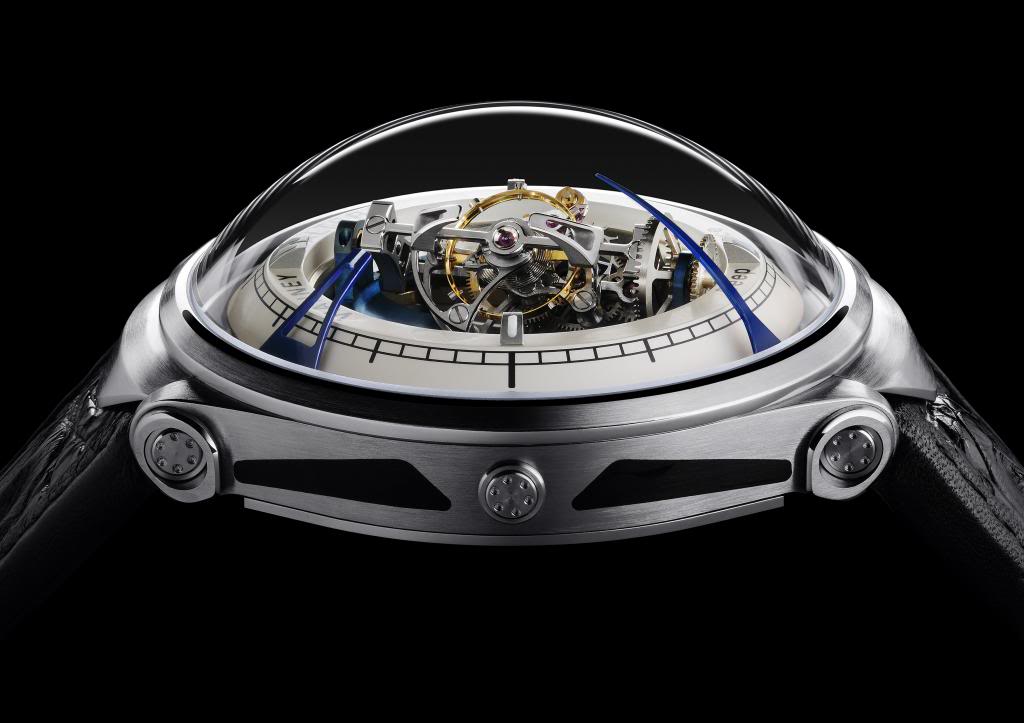 A rather pronounced sapphire anti-reflective dome sits above a 46mm (10mm thick) round titanium case. Underneath at the centre of the watch is a huge triple axis tourbillon, surrounded by a index ring with ‘chemin de fer’. Two curved blued steel hands lean out of the watch periphery and spread towards the tourbillon.