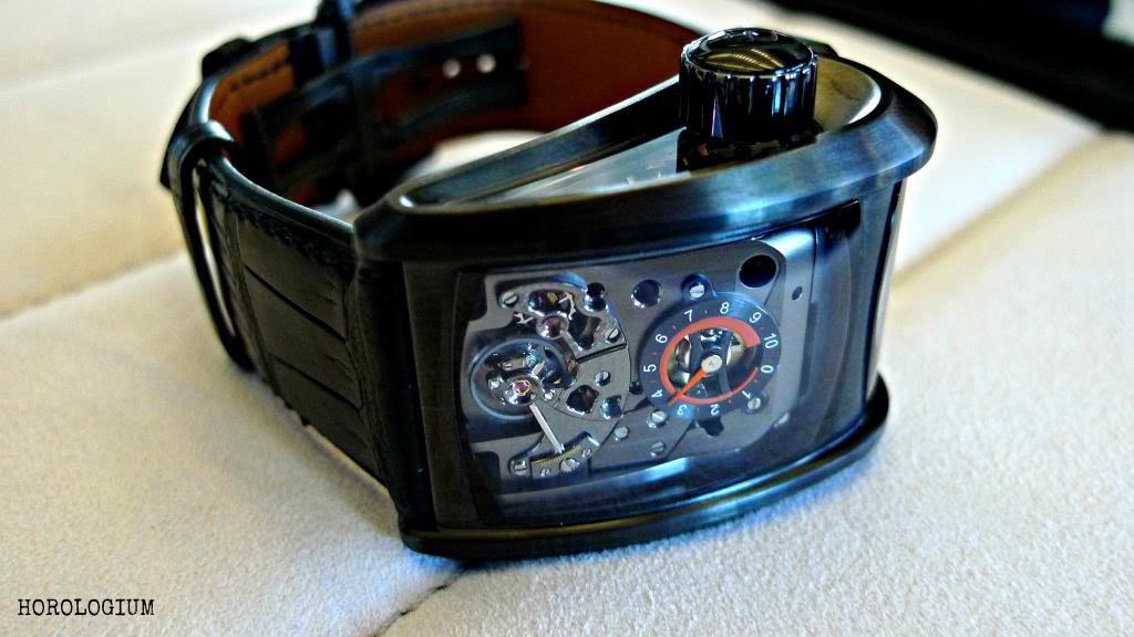 The Hour Glass’ limited edition model is darker and sportier due to the use of ADLC-coated 18ct white gold case. The regular model is just white gold. The Bugatti Super Sport Hour Glass edition is a darker, sportier version than the original, and the Hermés alligator leather strap’s buckle is in titanium.