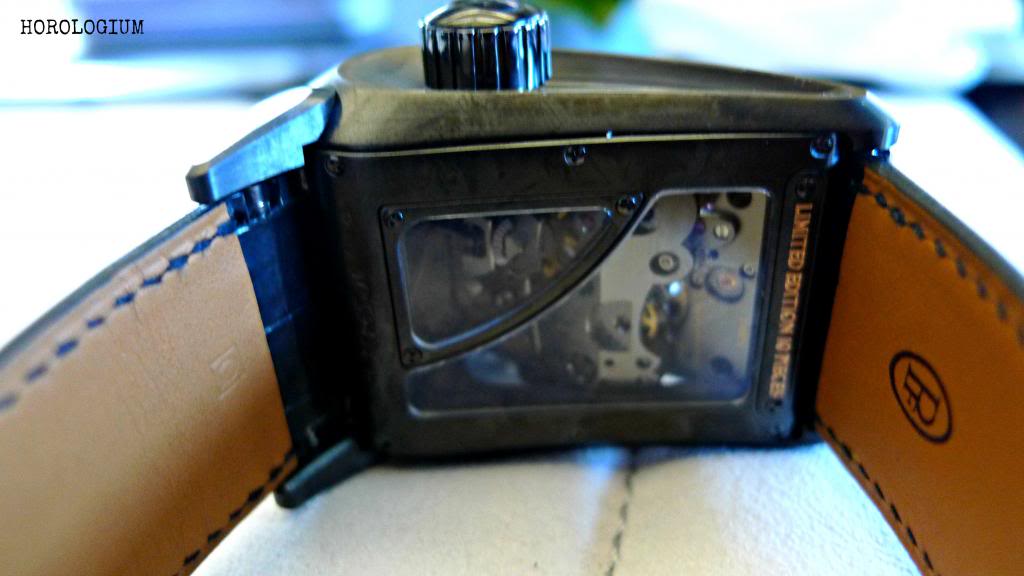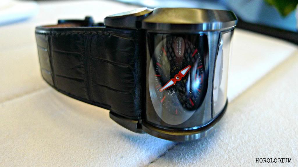There are six anti-reflective sapphire crystals on the exterior, through which you can see the 333 piece manual wind PF 372 movement with a power reserve (shown via an indicator) of ten days. It has ‘gold black’ rhodium and rose gold plates and bridges. With a height of 15.96mm, width of 25mm, and length of 37.01mm, you can understand the size of the watch. However, although a large and chunky piece, the curvature and shape make its bulk interesting and not uncomfortable to wear.
