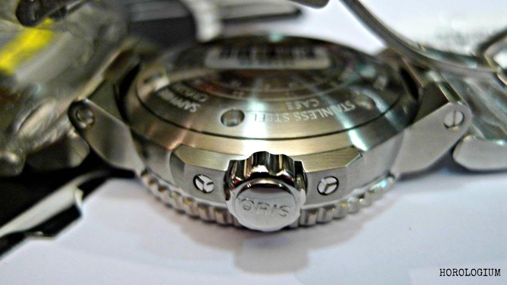 To prevent the crown from being accidentally interfered with, especially during dives, Oris have used a screw down that is embedded/ protected by stainless steel crown guards.