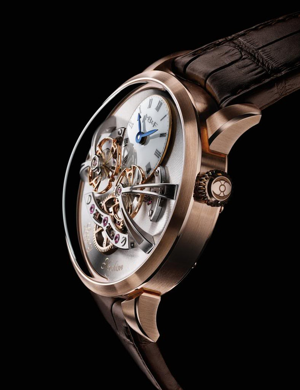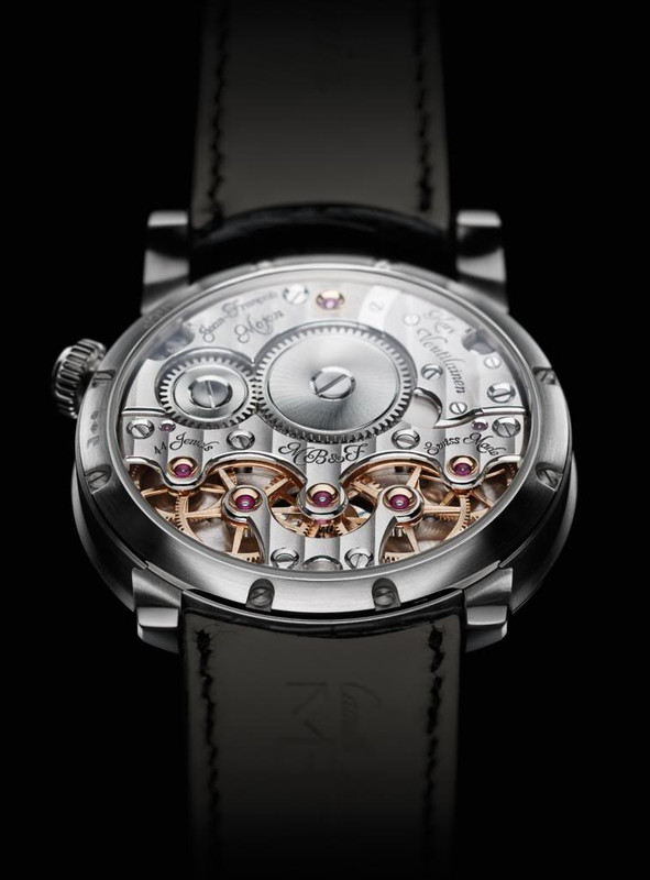 The movement of the LM2 has been developed by Jean-François Mojon and Kari Voutilainen. Mojon was awarded with the best watchmaker award at the 2010 Grand Prix d’Horlogerie de Geneve. In keeping with MB&F’s spirit of acknowledging of the ‘friends’ with whom they collaborate, the names of the two men responsible for the movement are hand engraved on the back. The movement itself is hand-finished with gold chatons, beautiful mirror-polished bevels and Geneva waves.