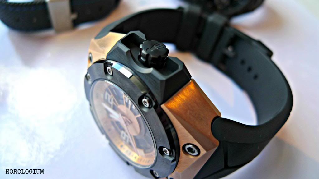 The hefty 44mm x 46mm x 15.25mm thick case is five parts in 18 carat rose gold with titanium DLC, ceramic bezel, anti-reflective sapphire glass, and an octopus on the screw-in crown and case back. This is a huge chunk of a watch that is especially so because of its thickness, and as such, really needs to be tried before you buy. Which brings me onto the next part of this post.