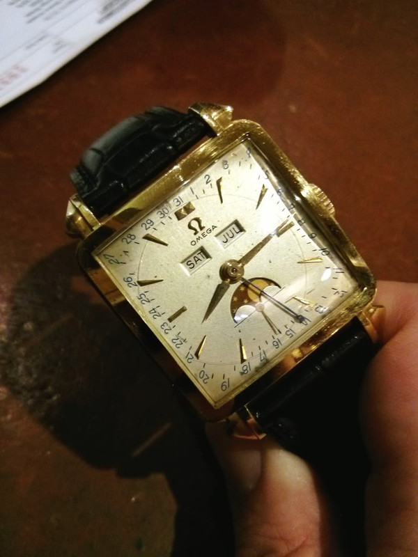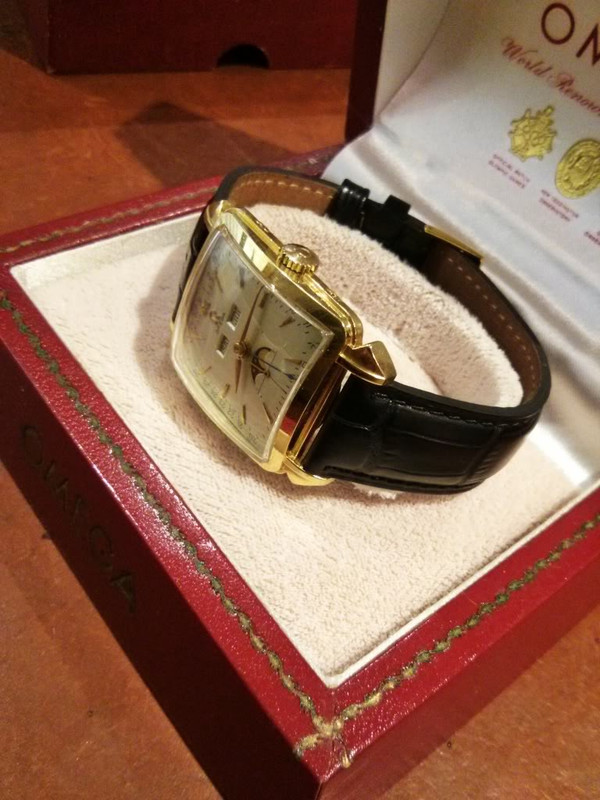 In 1947 Omega introduced their first calendar complication watch, the Cosmic Moonphase triple date calendar. It was produced, during the course of its existence, in both square and round cases, and with a variety of metals/ dial colours. It was the brand’s first watch that displayed the time and the date with hands and day, month and moon phase in windows. The square models were introduced in 1951, and it is one of these, in 14k yellow gold, that is the subject of today’s post.