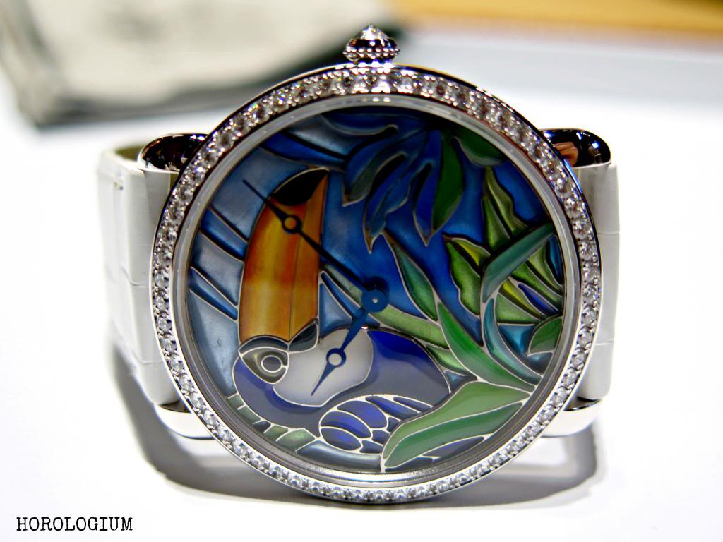 The second bird to be featured today is a Toucan. Also in an 18k white gold case with 60 brilliant-cut diamonds (total of 1.56 carats), this watch features enamelling work and mother-of-pearl to create three different levels of bird and surroundings. The enamelling is done by the craftsman/ woman assembling a gold framework/ sectioning, and then adding three layers of enamel plates of differing thickness. Thus when the light plays on these three superimposed plates, depending on the angle at which you look at the dial, the Toucan seems less of a two-dimensional creature. This is a more whimsical piece than the previous one, the Toucan almost looks slightly perturbed.