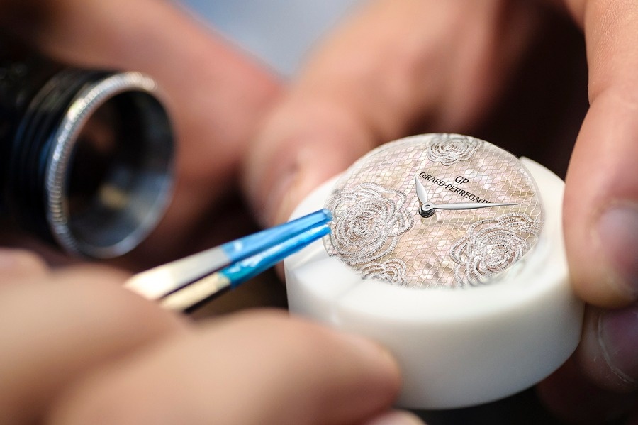 The ‘bloom’ of the model name refers to the floral decoration of the dial, a peony. The ’embroidered’ look of the peonies is made by applying seven layers of material atop each other and overlaid onto the white (for the grey model, hand-polished beige for the brown model) surface the mother-of-pearl dial, with the lace-like decoration giving the dial a trio of different textures and layers. There is also a sheen to the dial, which is due to the application of a silver powder for this grey model, and gold powder for the brown.