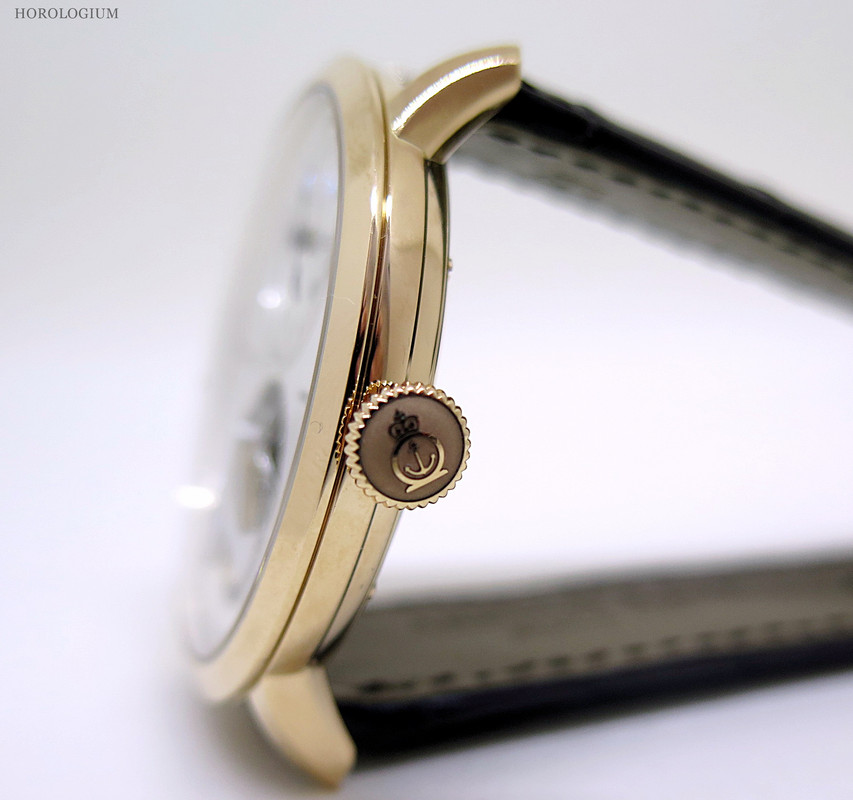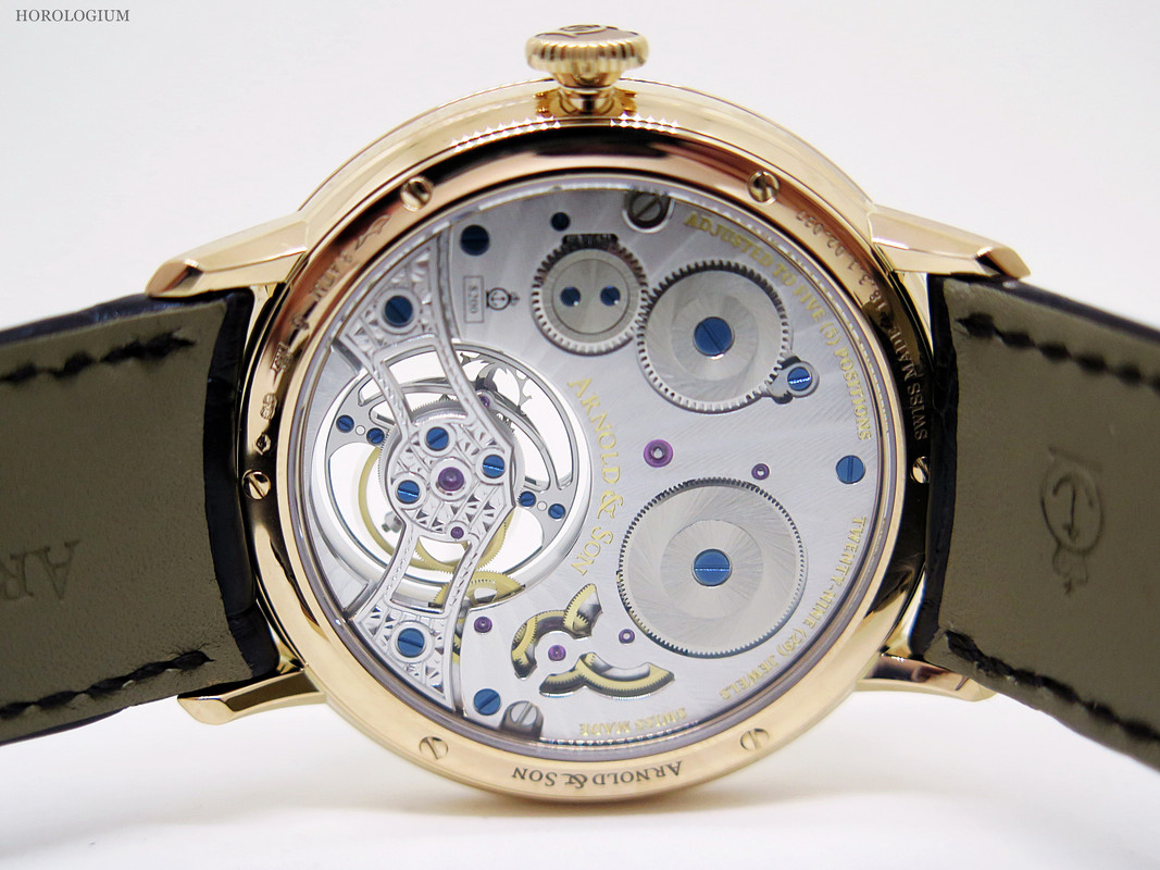 The ultra thin UTTE movement, visible through the open caseback, is finished with the traditional straight Côtes de Genève pattern on the palladium model, and Côtes de Genève rayonnantes (i.e. sunray) on the red-gold version. It surely must be a sign of commitment to the UTTEs that Arnold & Son have gone to the effort of not just metal and dial differentiations but also extending this to the movement as well, instead of just putting the same dial and visually identical movement into two different types of cases.