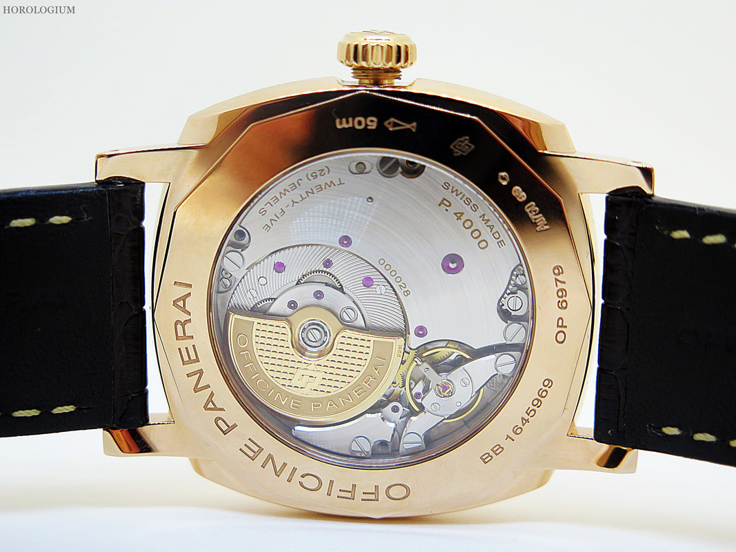 What is so special about the new PAM572 and PAM573 (the latter a RG ‘Oro Rosso’version)? Well inside this new 3.95mm thick 45mm case is Officine Panerai’s first automatic movement with a micro-rotor. Watch people get excited about micro-rotors for a myriad of reasons to do with slimness, technical achievement, and aesthetics; there is no right/ wrong reason, but there is little doubt that they are attention-grabbers and attractive to many people. The new movement is also part of the first automatic Radiomir 1940.