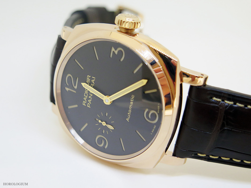 As mentioned, this new piece will come in two versions – a stainless steel one with the micro-rotor in tungsten, and a red gold model with a gold rotor, circular brushed finishing, gilded engraving. The PAM572’s dial is black with luminous Arabic numerals and hour indices, the PAM573 has a brown dial and the same luminous numerals and indices. The water resistance for the PAM572 is 10 bar (100m) and 5 bar (50m) for the PAM573.
